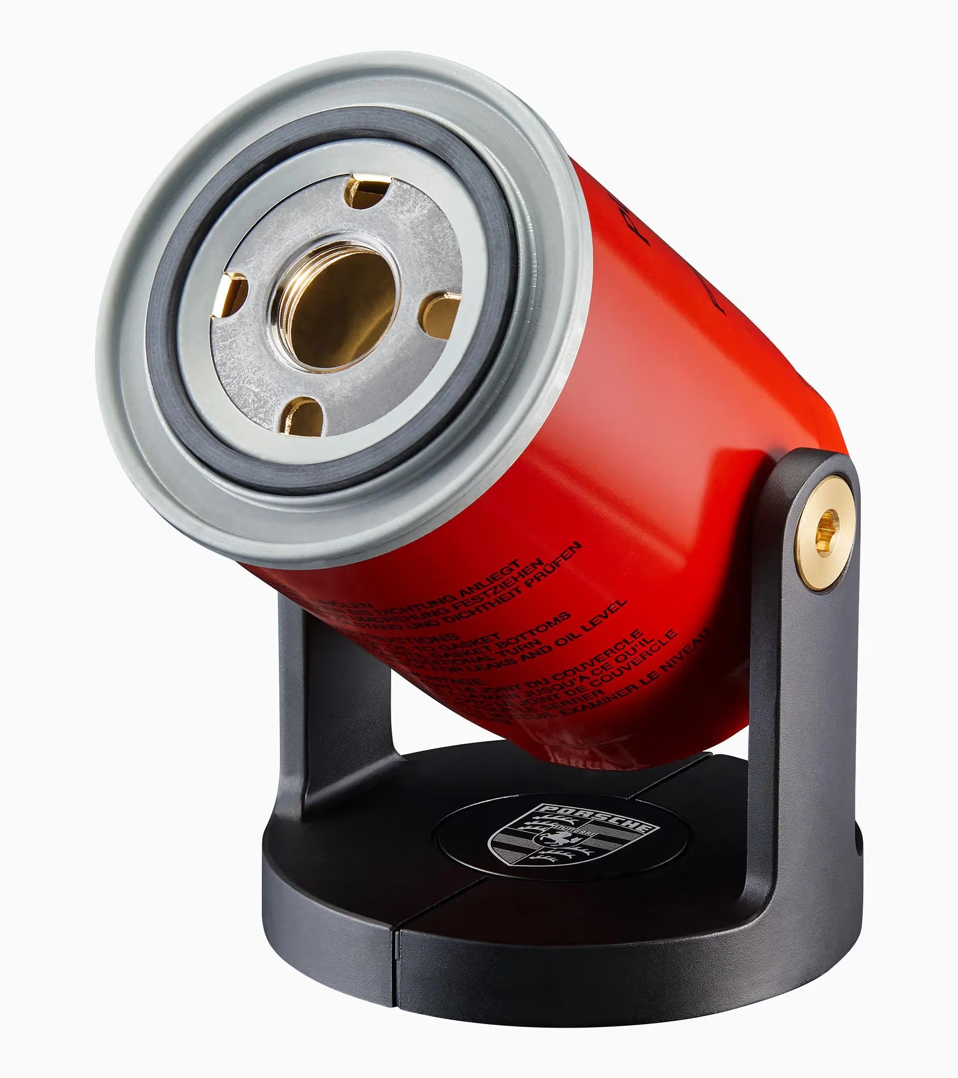 Fa luce! L'esclusiva torcia 911 non solo porta la luce nell'oscurità, ma anche un tocco di design intelligente nell'ambiente. La torcia è costituita da un filtro dell'olio originale di colore rosso con stampa nera originale e può essere accesa e spenta utilizzando la funzione touch nella base.