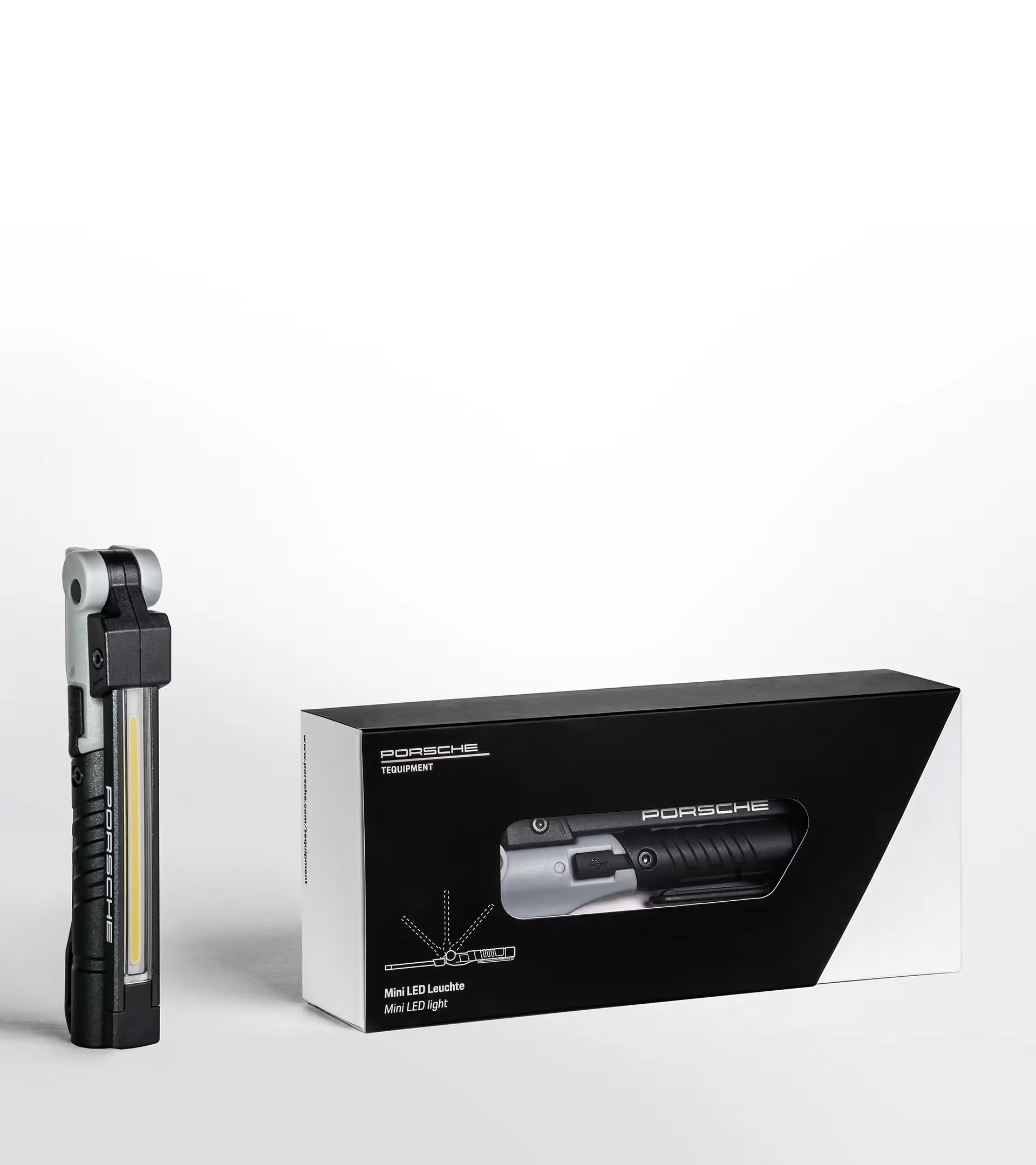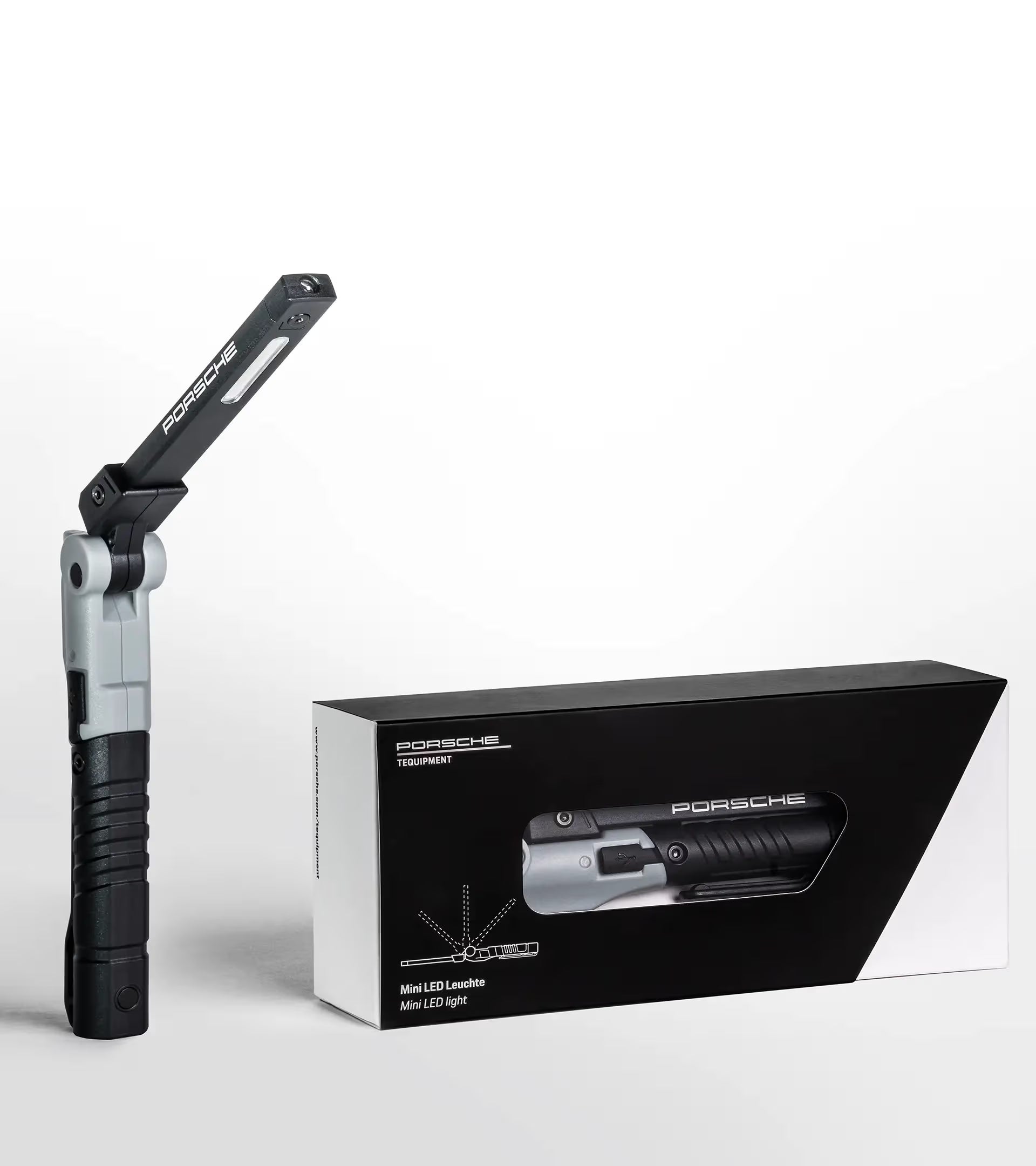 La mini lampada a LED compatta di Porsche Tequipment è uno strumento affidabile in ogni officina. Il braccio LED flessibile è dotato di due forti luci principali e di un'ulteriore luce di ricerca LED sulla testa della lampada. Per lavorare con entrambe le mani libere, la lampada può essere fissata saldamente con una clip da cintura o su superfici magnetiche.