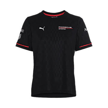 La t-shirt sportiva da donna colpisce per il suo taglio leggero e sagomato, che assicura comfort e libertà di movimento. Dal punto di vista visivo, la maglietta attira l’attenzione grazie al motivo Pasha tono su tono presente su tutta la superficie. Il girocollo classico, i profili rossi e la scritta Porsche aggiungono accenti dinamici. Il carattere motorsport è sottolineato dalle stampe con logo e sponsor, oltre all’etichetta Raceborn sul retro.